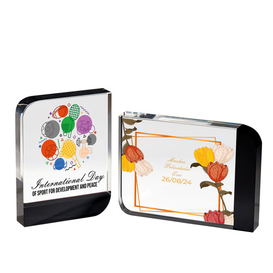 Pueden personalizarse con grabado láser, impresión a color o combinación con otros materiales como metal o madera para un toque exclusivo. Disponibles en diferentes formas: placas, columnas, figuras geométricas, entre otros.
