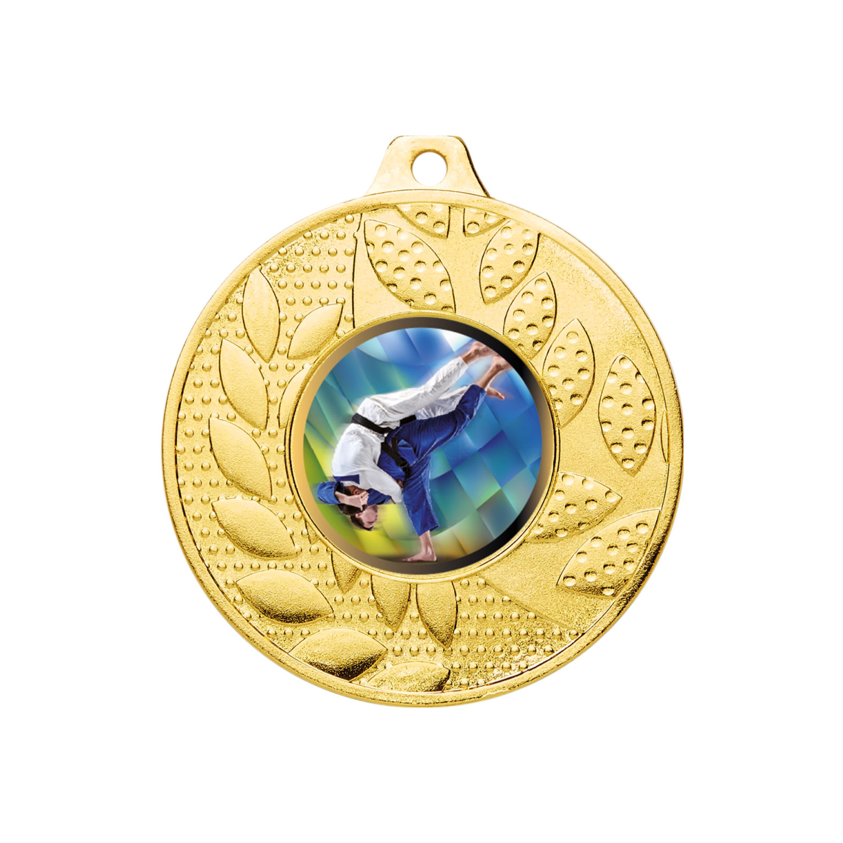 Medalla de metal con portamotivo tres colores de ∅50mm. Incluye cinta con Mosquetón de 10 mm.