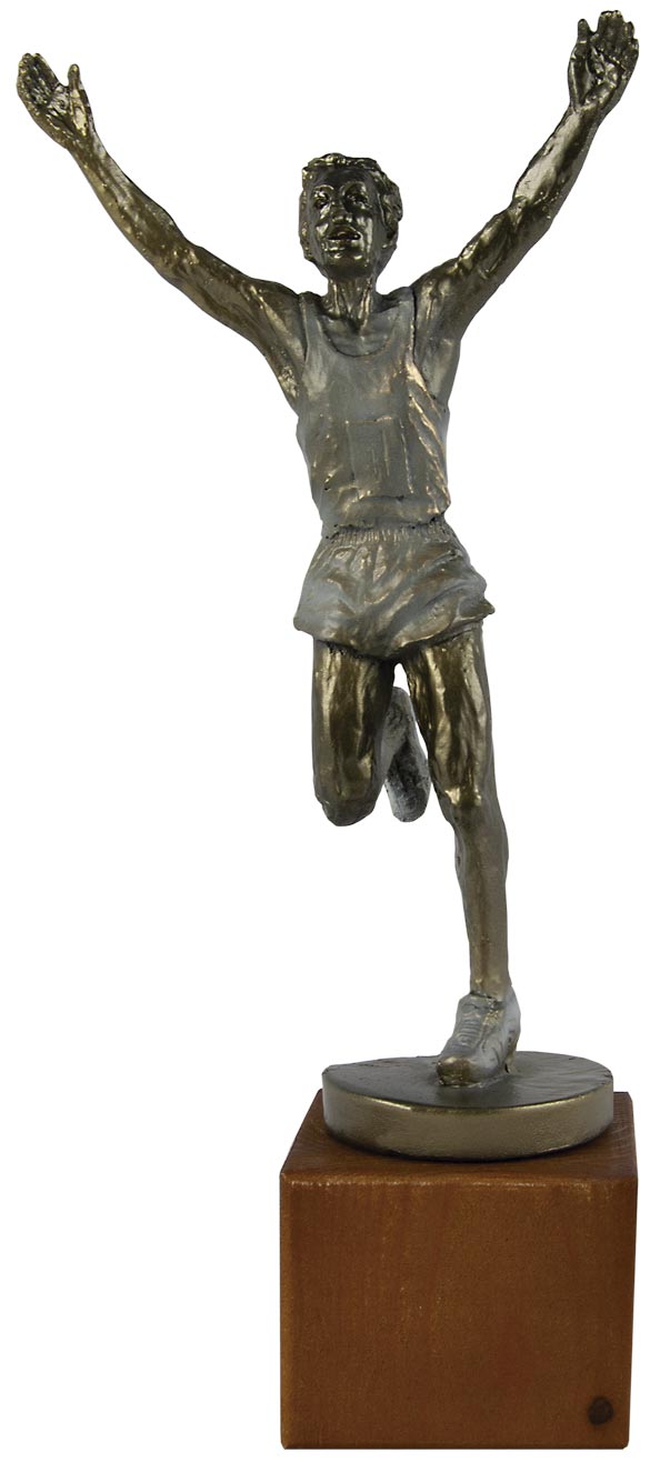 Trofeo de atletismo con figura de hombre, fabricado con resina a color oro viejo y sobre peana de madera.