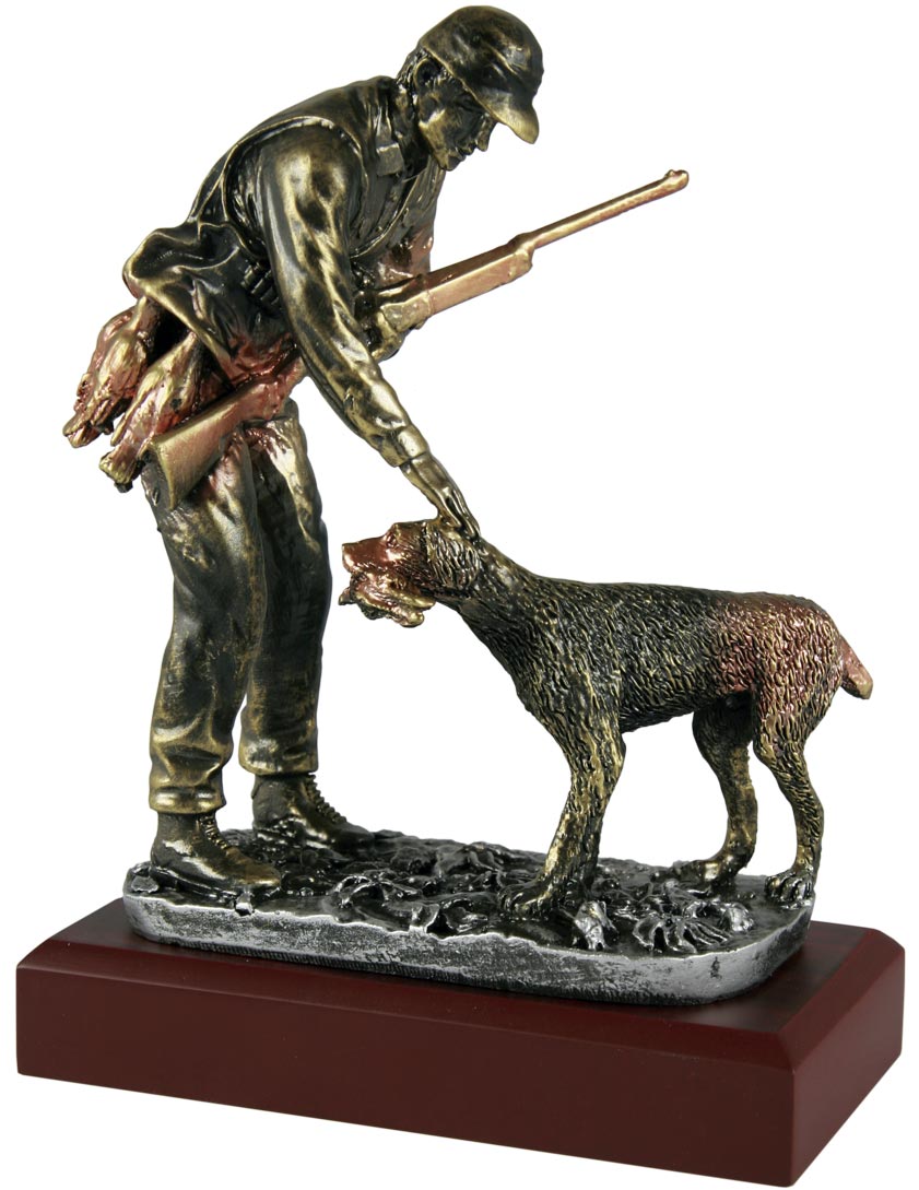 Trofeo figura de cazador y perro, fabricado en resina a color oro viejo, sobre peana de madera.